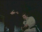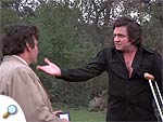 Columbo zeigt seinen Ausweis einem Polizisten, der ihn am Tatort anhält.