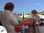 Columbo zeigt seinen Ausweis auf einem Flugplatz einem Flugzeugtechniker.