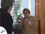 Columbo zeigt dem Pförtner seinen Ausweis, um zu Mrs. Chandler durchgelassen zu werden.